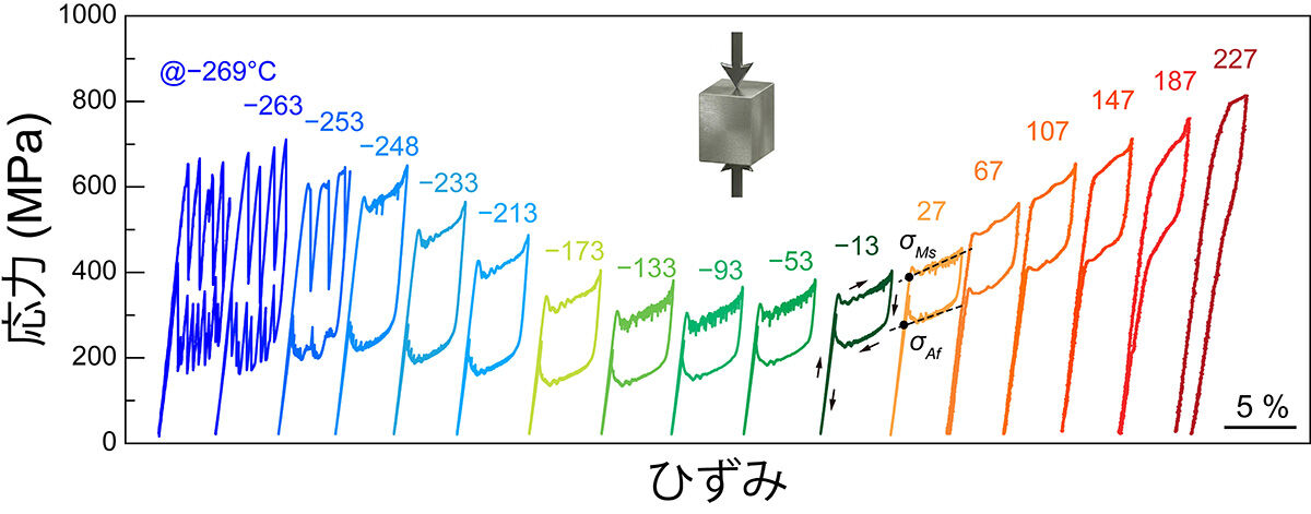 図2. Ti-Al-Cr超弾性合金の各温度における圧縮応力-ひずみ曲線。−269 ℃から+227 ℃にわたる広い温度範囲で測定を行い、+187 ℃以下では応力を解放すると元の形に戻る「超弾性」と呼ばれる性質が確認された。