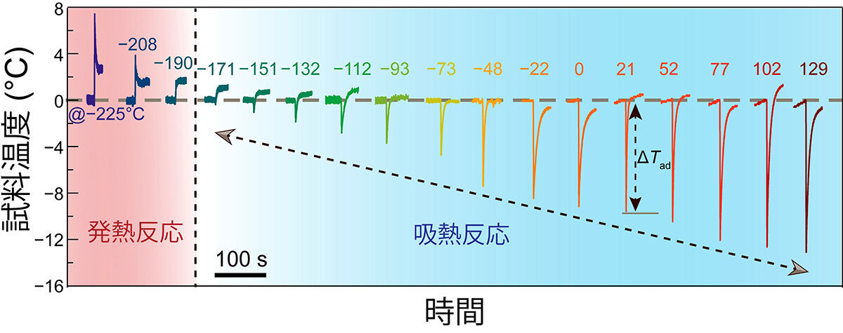 ✣ 室温において約−10 ℃の断熱温度変化と高い冷却効率を達成しました。