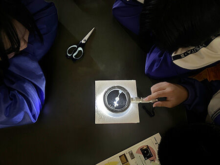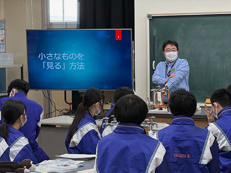 Next, in the theme "How to 'see' small things" by Mr. TAKAHASHI Kazutoshi, Radiation Control Section, gave a presentation. The students challenged to make a "cloud chamber" through group work, which allowed alpha radiation to be visualized in supersaturated ethanol.