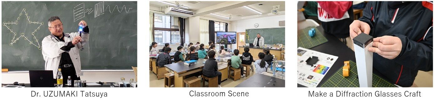 A hands-on workshop titled "Light Kaleidoscope" was held for third-grade students by Dr. UZUMAKI Tatsuya from the Public Relations Section.
