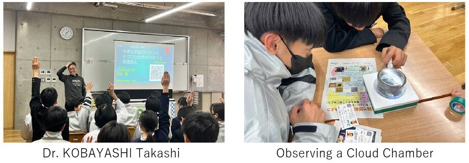 The program was designed to encourage students to learn actively while enjoying the experience. In addition to a lecture, the class included a question-and-answer session and group work using a cloud chamber experiment. Participating students asked questions such as "How was the universe created?", "What triggered the formation of the Earth?", "Why does fog form inside the cloud chamber?", and "Why do these results occur?", and engaged in lively exchanges of opinions with Dr. KOBAYASHI.