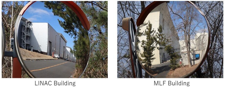 The photos show the LINAC Building and the MLF Building reflected in convex traffic mirrors near each facility. The LINAC Building is about 330 m long, about the length of Tokyo Tower laid on its side. For this reason, the entire building cannot be captured in the mirror, even when the viewing angle is changed. In contrast, the MLF Building is about 150 m long and 70 m wide, and it has a volume large enough to hold two jumbo jets if the inside were hollow. Even so, only part of the building can be seen in the mirror.