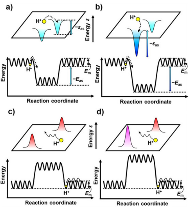 図2. プロトン伝導体におけるプロトンのエネルギー(Energy)の模式図。アクセプターを添加した材料(a)と(b)ではプロトンがアクセプターに引き寄せられ移動が阻害される。