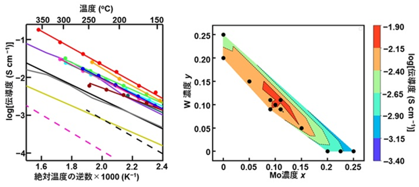 図3. BaSc0.8Mo0.1W0.1O2.8の高い伝導度(左図の赤色の丸と線)は、本研究で調べたBaSc1−x−yMoXWyO3−δの中で最も高い伝導度を示す(右図の黒丸。右図ではBaSc1−x−yMoxWyO3−δのMo濃度xを横軸、W濃度yを縦軸で表した化学組成における伝導度をカラーで示している。赤い部分が最も伝導度が高い)。左図のデータの詳細は次の通り。本研究のデータ:BaSc0.82Mo0.09W0.09O2.77(青色)、BaSc0.8Mo0.1W0.1O2.8(赤色)、BaSc0.78Mo0.11W0.11O2.83(オレンジ色)、BaSc0.75W0.25O2.875(濃い緑色)、BaSc0.8W0.2O2.8(紫色)、BaSc0.8Mo0.05W0.15O2.8(水色)、BaSc0.8Mo0.09W0.11O2.8(ピンク色)、BaSc0.8Mo0.11W0.09O2.8(茶色)、BaSc0.8Mo0.15W0.05O2.8(薄緑色)。文献のデータ(詳細は原著論文を参照):BaSc0.8Mo0.2O2.8(黒色線)、BaSc0.775Mo0.225O2.8375(灰色)、 BaSc0.75Mo0.25O2.875(黄色)、BaCe0.9Y0.1O2.95(ピンク色の破線)、BaZr0.8Y0.2O2.9(黒色の破線)。©著者ら(2026)