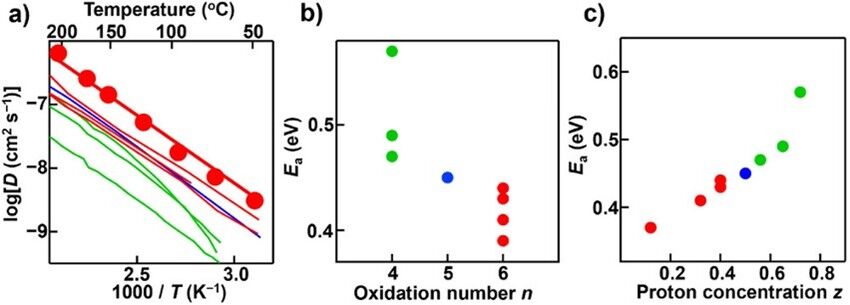 また、プロトンの拡散係数を、プロトン伝導度とプロトン濃度から計算しました(図5a)。その結果、ドナーの価数が高いほど拡散係数が低温側で高い傾向を示すことが分かりました(図5a)。その原因はドナーの価数が高いほど活性化エネルギーが低くなる傾向(図5b)にあると考えられます。ドナーの価数が増大すると、酸素空孔量が減少し、プロトン濃度が低くなる傾向があります。プロトン濃度が高くなるにつれて拡散係数が高くなるため(図5c)、ドナーの価数の増加とともに拡散係数の活性化エネルギーが低下するので、低温で拡散係数が高くなり、プロトン伝導度が高くなると考えられます。そのため本研究で用いた6価のドナーを添加した材料は、4価のドナーを添加した材料より伝導度が高いと考えられます。
