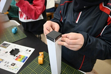 広報セクションの宇津巻 竜也氏が、3年生を対象に「光のまんげきょう」工作・実験教室を行いました。