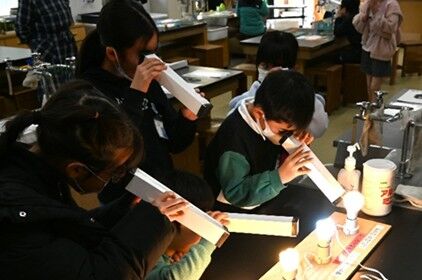 ブラックライトで液体を照らすと何色になるか、偏光シートを2枚重ねて片方のシートを回転させると見え方が変化する不思議などを体験しました。最後に、分光シートを用いた「まんげきょう」の工作を行いました。「まんげきょう」から虹色の光を見ることができて、児童は満足しているようでした。