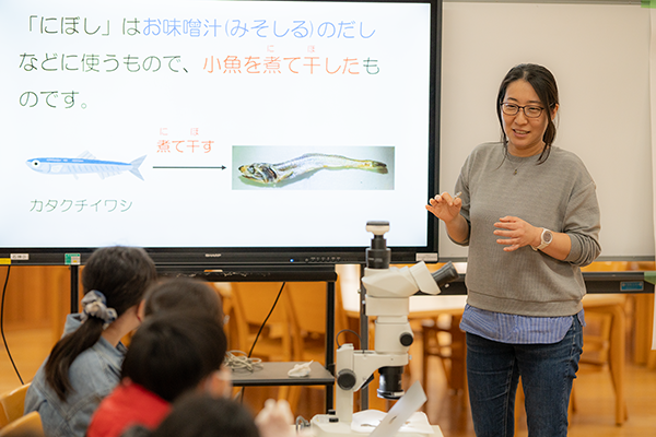 授業は、『研究の第一歩は、よく目で見ること!』を合言葉に、「泳ぎの達人 ミジンコを見よう!」、「にぼしの解剖(かいぼう)」の2つのテーマで行いました。