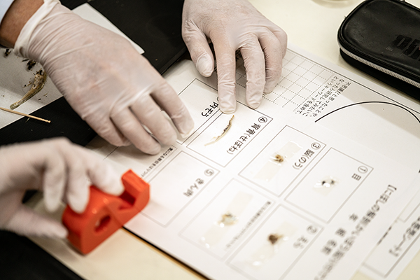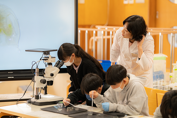 小学校4年生の理科では「わたしたちの体と運動」の単元で、人の体の構造について学習します。参加した児童の皆さんは、顕微鏡を使ってミジンコの動きを観察したり、虫めがねを使って、解剖中のにぼしの体の各部分を観察することで、生き物の体の構造を通して「命」について学習しました。積極的に質問する児童も多く、非常に有意義な授業となりました。