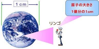 そしてその小さな私たちが手にしている、小さなリンゴがおよそ1億分の1cm、原子の大きさです。
